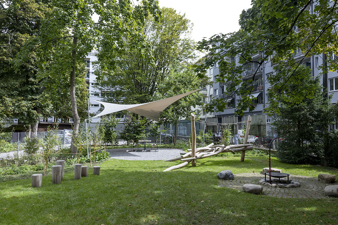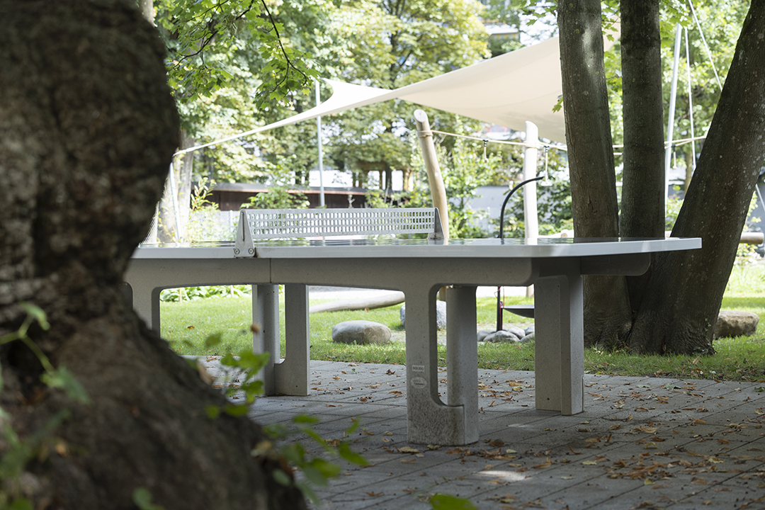 Ein Sitzplatz mit Tisch bietet Raum für Ruhe, Gespräche oder gemeinsame Aktivitäten. Am Tischtennistisch kann Energie abgebaut und Bewegung ausgelebt werden. Das Klettergerüst fördert spielerisch Gleichgewicht und Koordination. Ergänzt wird der Aussenraum durch Rückzugsorte sowie schattige Plätze, die Erholung und Sicherheit bieten.